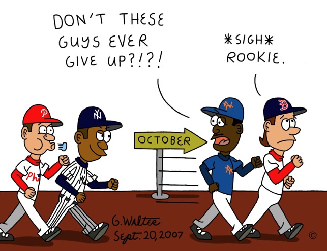 While fans are content to take a comfortable multi-game lead and coast into the playoffs, it's absolutely boring for the writers. Think about it: win, win, win. It gets dull after a while. Where's the drama? Where's the tension? How did the Yankees do today? They won. The Mets? They won too. See what I mean? It's then that you start reaching for the remote and wondering what the new fall lineup looks like. You need that unease, that anxiety that sweetens a victory. Where are the crossed fingers and prayers to the baseball gods for a miracle? They're making a comeback along with the Yankees and Phillies, and I couldn't be happier.