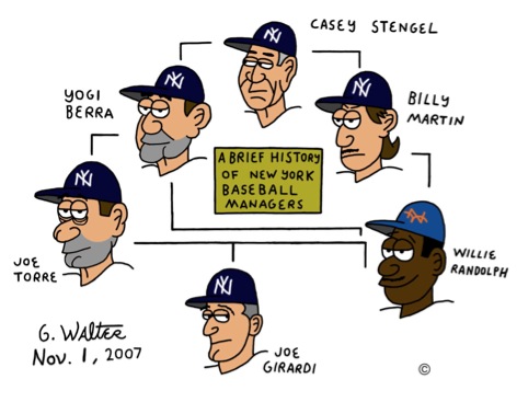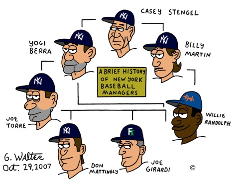 Have you ever stopped to consider the pedigrees of managers in this town? My guess is not. If so, many would have realized that for both the Yankees and the Mets and the men who currently helm them there is a legacy that dates all the way back to Casey Stengel. Willie Randolph and Joe Girardi both had to learn from somebody right? And I confess, I spent quite a while tracing the genealogical lines back, trying to find the link anywhere I could. Here's a trivia question for you: Three of the managers depicted in the cartoon to the right have managed both New York Teams (Yankees and Mets). Who was the fourth? The answer will be at the end -- hey, I have to keep you reading somehow don't I?