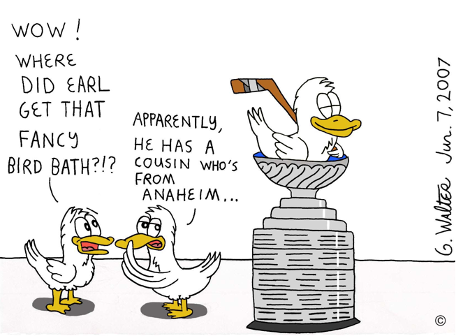 When the Anaheim Ducks won the Stanley Cup, I did this cartoon just for fun, never submitting it, just keeping it for myself. I had been thinking about what would a duck actually use the Stanley Cup for, and then it hit me and it seemed so obvious.