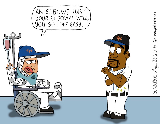 This was the Met injury cartoon that I talked about a week ago, and seeing as how Johan Santana is set to have season-ending arthroscopic surgery to remove some bone chips, I decided to put it on paper. Of course, other members of the Mets clubhouse have it far worse.