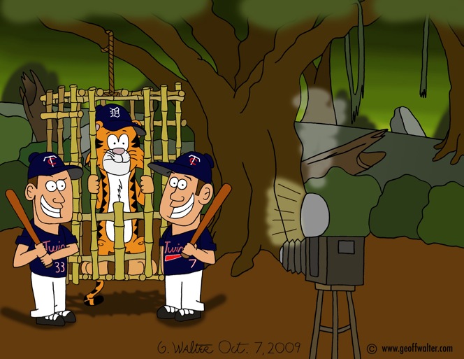 The cartoon you see above is probably the most intensive one I’ve done since the Mr. Met Opening Day comic. It combines two cartoons - yes, you read that correctly - as I drew Mauer, Morneau and the caged Tiger on one sheet, and the background on another.