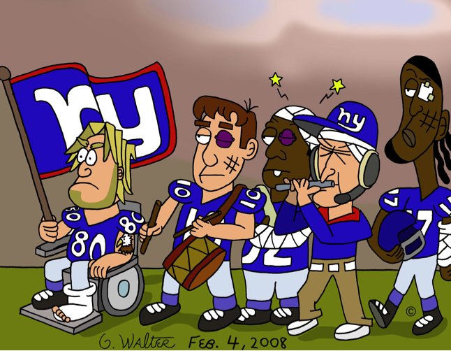 This is the cartoon I would have submitted had the Giants lost the Superbowl to the Patriots. In the losing cartoon I wanted to convey that even though they were beaten, the Giants played valiantly. I remember the Revolutionary War painting “The Spirit of ‘76” and set out to replicate that, albeit with a bunch of battered and bruised Giants.