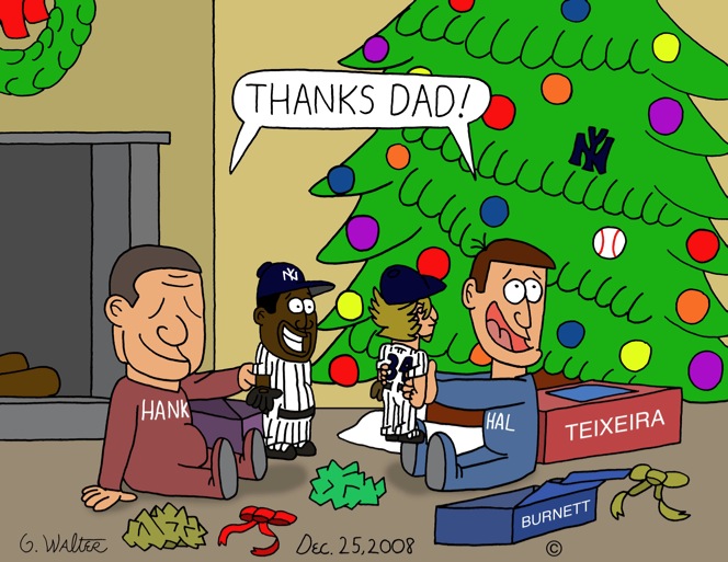 Merry Christmas Everybody! I wondered what Christmas morning at the Steinbrenner house would be like this year - what with all the spending going on - and envisioned Hank and Hal as boys opening their presents of Sabathia, Burnett, and Teixeira action figures. I imagine the boys will go off and place them on the mound and first base in their giant Yankee Stadium playset (also life-size), Ha Ha!