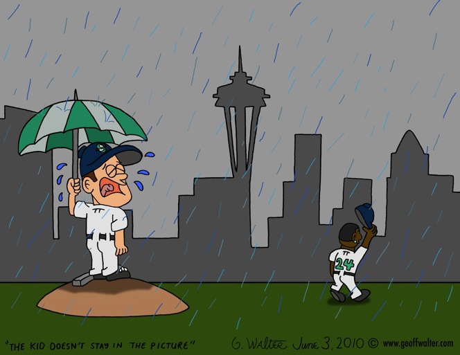 I thought up this cartoon after I read a quote from Milton Bradley upon hearing that Griffey retired: “On a day like this, it should rain in Seattle.”