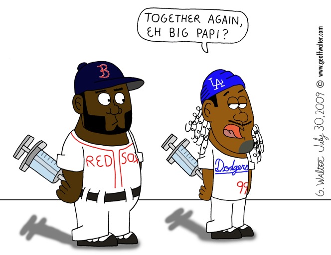 I happened to be walking through the mall and near the sporting goods store when I noticed they had ESPN on the monitors with the news that both Manny Ramirez and David Ortiz were on the infamous 2003 MLB steroid list of players testing positive for banned performance enhancers.