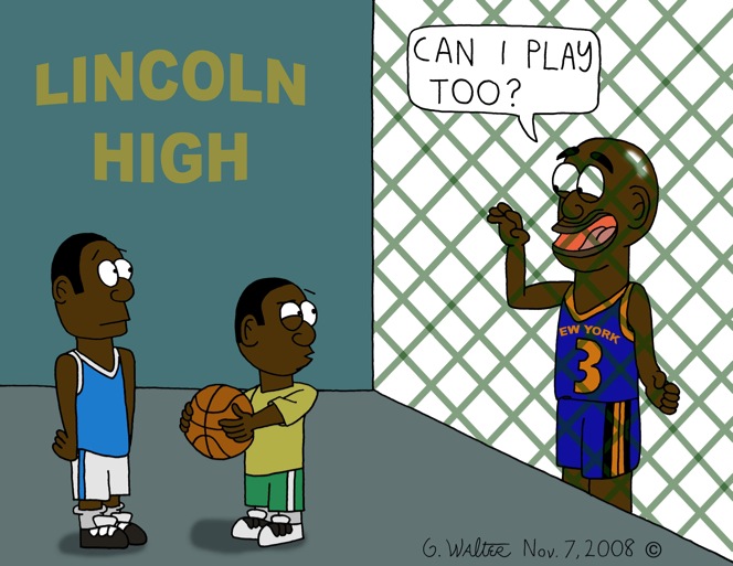 Having apparently been permanently benched by the Knicks, Stephon Marbury is apparently thinking about playing with his old high school basketball team from Brooklyn. You just have to wonder what the reaction would be to Marbury returning to his old stomping grounds. I did toy with the idea of having him be part of the old “picking players” routine from the schoolyard, but decided it had been done so many times before, and Steph asking if he could play just was irresistible.