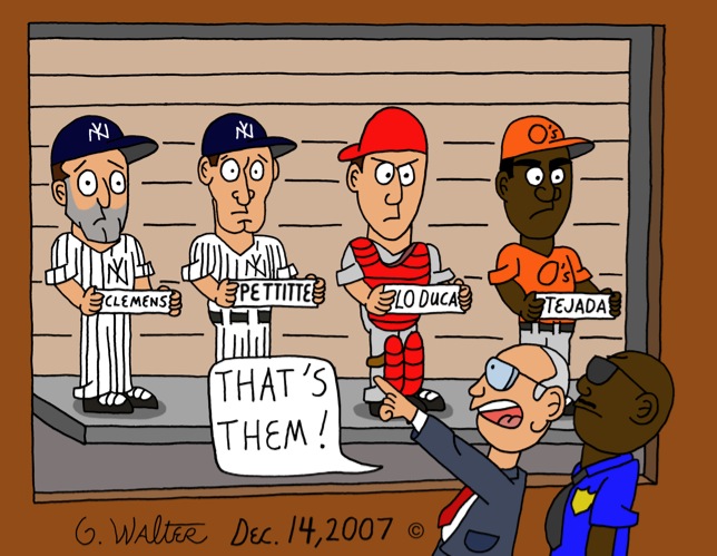 I had actually drawn another cartoon in preparation for the Mitchell report being unveiled, but once the names were revealed, I settled on a police lineup with Sen. George Mitchell (*cough* Red Sox *cough*) in a “J’accuse!” (French for “I accuse”) moment. The cop from previous cartoons makes a return as well. Miguel Tejada had just been traded (how convenient) to Baltimore, and now former Met Paul Lo Duca was just introduced as a Washington National three days ago.
