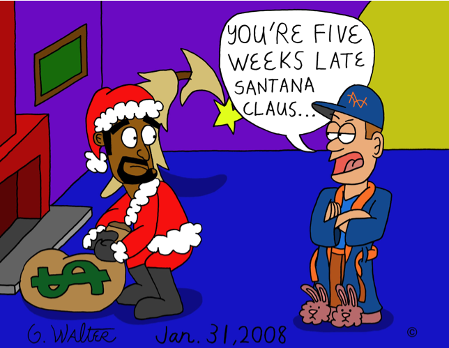 Well the Mets finally got Johan Santana in their rotation - better late than never. Since everyone in New York was calling him “Santana Claus” before Christmas, I had wanted to draw him in a sleigh bringing presents to whichever New York team managed to get him, and maybe have Omar or Cashman as one of his elves.