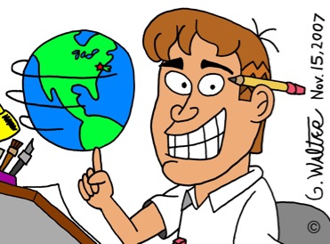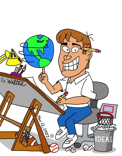 I wanted to have some fun with this one, and it would show off just how much I had improved my style. I had thought that the layout of each page would be similar to the “Geoff the Ref” space with a small icon on the upper left hand side. Since the space bore my name, I would have to draw myself in front of a drawing desk with my lamp and all the tools of my trade. The globe spinning was another natural fit, and took me two years to fully pull off with a basketball in real life. And yes, I truly am left handed.