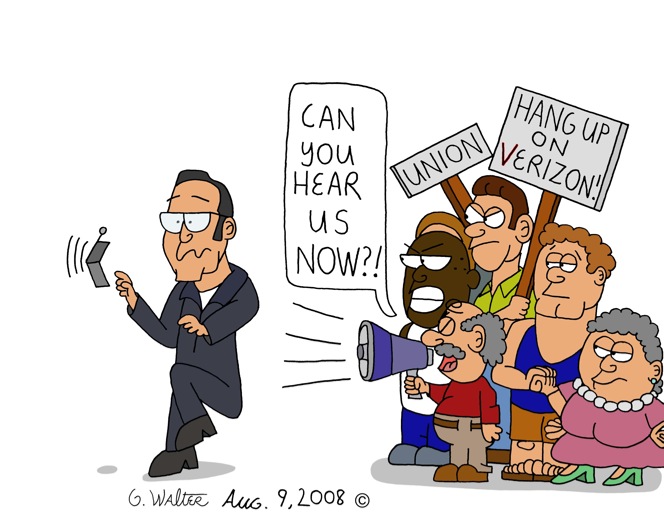 Local Verizon workers are picketing because their contract is expiring, and the “Verizon Guy” was just a perfect character to use.