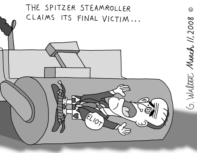 After NY Gov. Eliot Spitzer claimed he was a f-ing steamroller, it has always played a part in cartoons involving him in my view. Now it looks as though he’s going to be flattened and forced to resign from office.