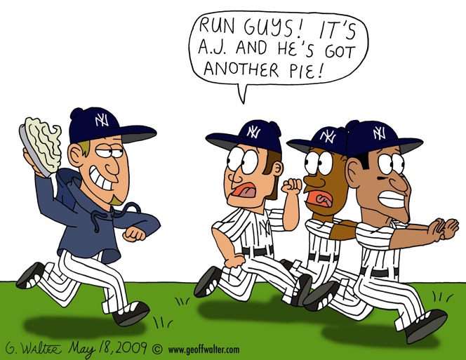 Another win for the Yankees in dramatic fashion and another player gets a face full of whipped cream courtesy of AJ Burnett. I think I’m finally getting the righty starter down, solidifying his look with that hoodie and he’s quickly taking a place as one of my favorite players to draw.