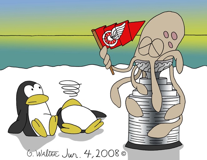 Well Detroit won, defeating the Penguins 3-2 in game six, so here’s the final cartoon with the octopus obviously enjoying the fruits of his victory. You can really see the improvement in my Stanley Cup over last year’s cartoon, with the se of gradients and it’s something that I’m really proud of as it looks completely three-dimensional.