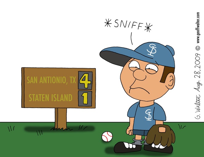 There’s a lot of Charlie Brown references that I could do, and I thought of doing one with the kid’s mouth agape in angst, tears pouring down onto the ground, but I remembered that immortal line from “A League of Their Own” that Tom Hanks uttered: “There’s no crying in baseball!” So the little tyke has to keep a stiff upper lip - very difficult when you’ve just lost.