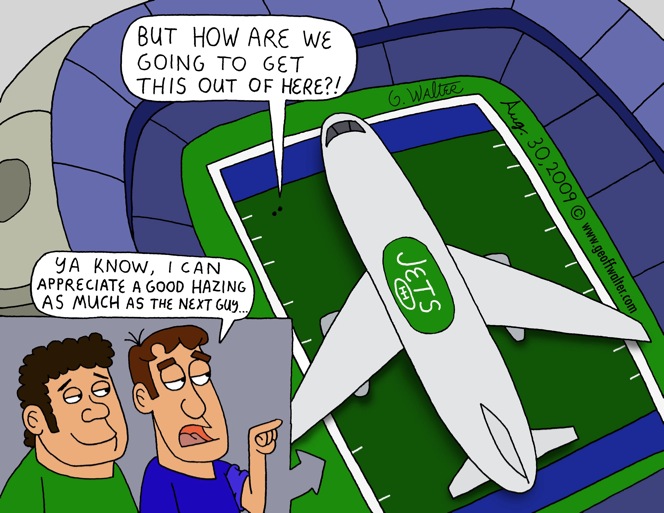 A take off of the cliché college prank of assembling a car inside a home or the Animal House take of the horse inside Dean Wormer’s office, I thought about having Eli Manning and maybe another Giant in a wind tunnel with one of the plane’s jets (get it?) blowing them around and Jets QB Mark Sanchez at the controls. A second possibility would be having the Giants clutching on the wing of a jet hanging on for dear life. This seemed much more hilarious and Eli’s question much more pertinent for the “We” because the two share the same stadium.