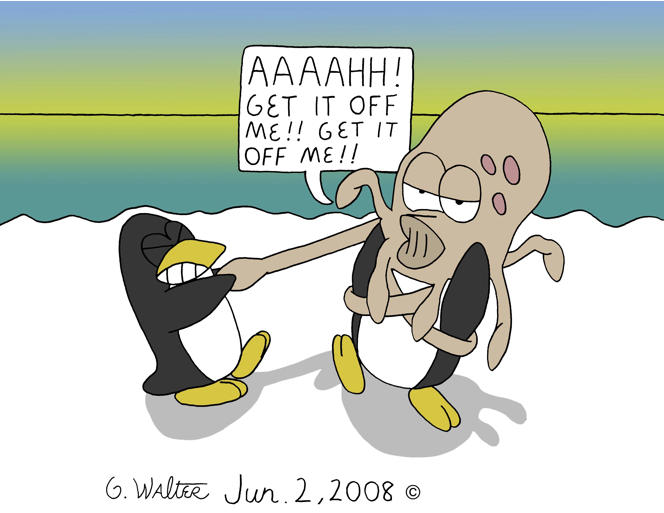 The octopus attacks! You can just imagine one of the penguins trying to introduce himself to the “strange creature” and instantly being put in a head vice from our cephalopod.