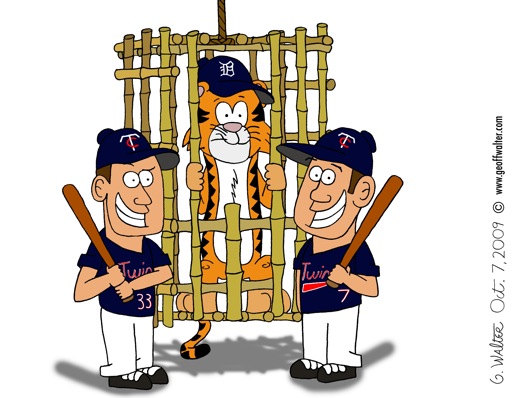 The cartoon you see above is probably the most intensive one I’ve done since the Mr. Met Opening Day comic. It combines two cartoons - yes, you read that correctly - as I drew Mauer, Morneau and the caged Tiger on one sheet, and the background on another.