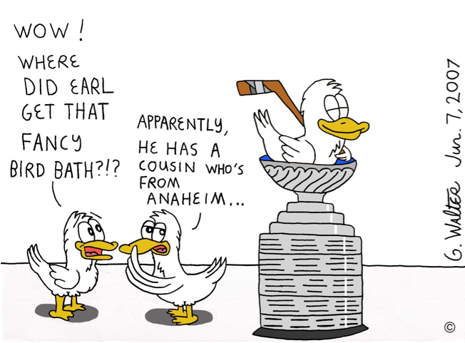 When the Anaheim Ducks won the Stanley Cup, I did this cartoon just for fun, never submitting it, just keeping it for myself. I had been thinking about what would a duck actually use the Stanley Cup for, and then it hit me and it seemed so obvious.