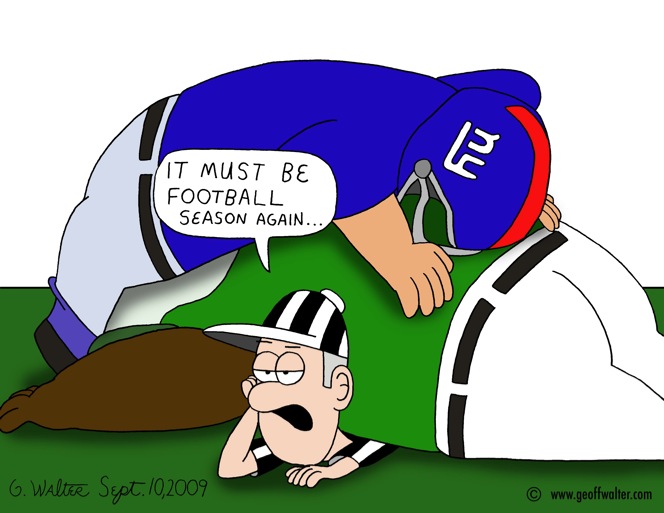 A sequel to a previous cartoon, this is most likely to become another one of my yearly efforts with The Ref being physically roughed up every kickoff day by the Giants and Jets and uttering the same iconic line.