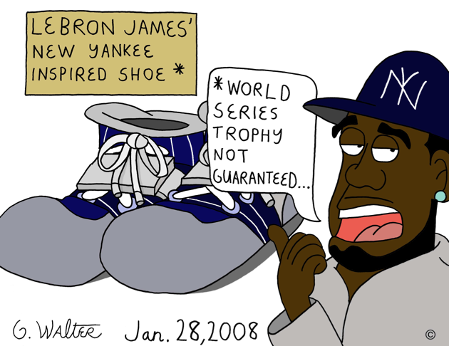 Every little kid expects to become Michael Jordan or whomever when they lace up shoes with their favorite player’s name on them, but it sadly doesn’t work that way. I read a story where LeBron James was coming out with a new Yankee-inspired shoe and had to draw this. Judging from the reaction the Cavalier got from the crowd during the ALDS between Cleveland and New York for wearing a Yankee hat, I think that he’s angling to get out of Cleveland any way he can and come to the Big Apple.