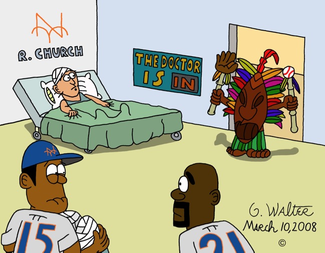 With all the injuries the Mets currently have, I decided to do another “trip to the hospital” theme. Beltran is recovering from surgery on both his knees, Delgado has an ailment to his right hip, and Church suffered a concussion (which for some reason because its baseball I find hilarious). I suspect that the Mets want their players to get better as fast as possible, so Omar called for some desperate measures - namely a witch doctor. The baseball and glove on the tops of his staffs were a nice touch that I came up with.