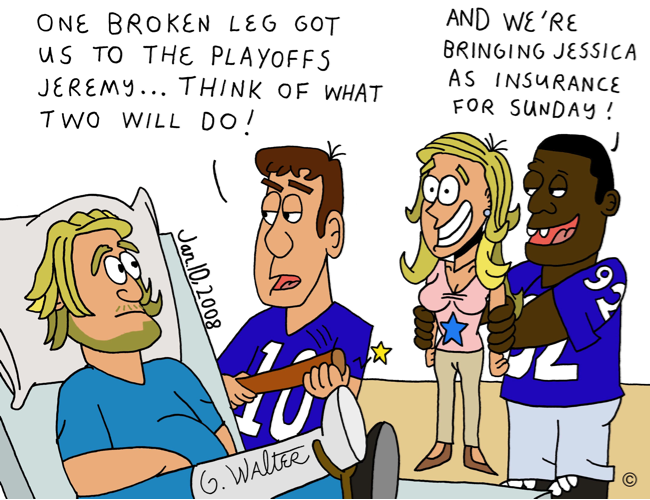 Someone brought to my attention that the Giants have actually been getting better since Shockey broke his leg. So how do you keep a good thing going? Easy - break the other leg! Jessica Simpson has been hated by Cowboys fans for distracting QB Tony Romo and showing up in a pink version of his jersey, so she’s the Giants’ backup plan. I actually think that this is my best Eli Manning yet. I just had to put my signature on Shockey’s cast.