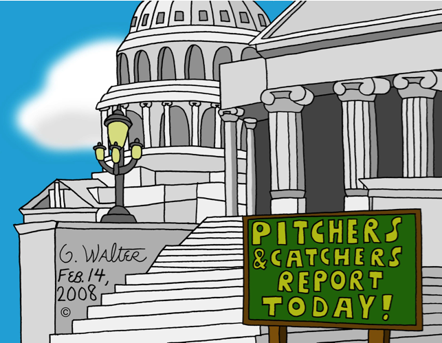 A clever little riff on the start of Spring Training. Drawing Congress is extremely hard, and again, I had much grander ideas of drawing the entire building, trying, erasing, and racking my brain as to how to draw the Capitol building. I then recalled an episode of “The Simpsons” entitled “Mr. Lisa Goes to Washington,” itself based on the Frank Capra classic “Mr. Smith Goes to Washington” with Jimmy Stewart, which had the perfect angle that I was looking for.