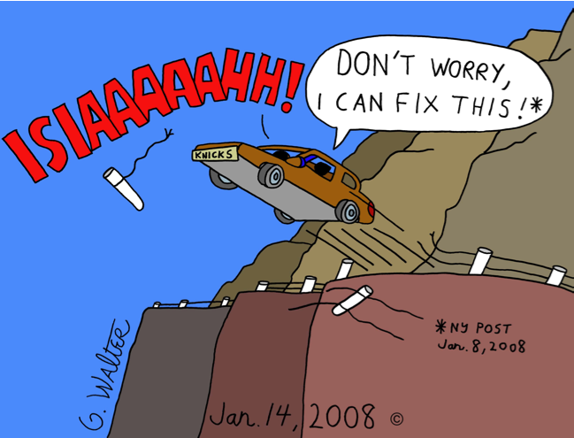 I really have to hand it to Isiah Thomas for coming up with irresistible quotes in the newspapers. Open mouth, insert foot. Drawing the car at the right angle was the most difficult thing here, as well as the wheels. I added the outline of Thomas in the driver’s seat and Dolan as the passenger, though I had wanted to show the two of them in full color with Dolan possibly jumping out of his seat in panic, but was constrained by space again.