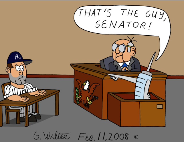 With Roger Clemens set to testify before Congress this week, I thought it would be funny to have another “J’accuse!” moment with the most unexpected and infallible witness Clemens could ever face. The senator is another nod to my judge from a long time ago (hey, a judge could run for the Senate, right?).