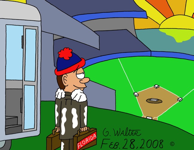 Due to the “no more bubble text” avenue my editor wants to explore, I came up with the idea of a New Yorker coming down to Florida to get out of the cold. It’s hard coming up with ideas, and even harder when you can’t use any text to get your meaning across. Even though Spring Training was already officially underway for a few days, yesterday was the first official game played by the Mets against the University of Michigan, so the cartoon fit well in context. We had a big helping of snow in New York this past week too, so I thought that this guy would be getting out of the snow - don’t ask me why it didn’t melt - it’s a cartoon!