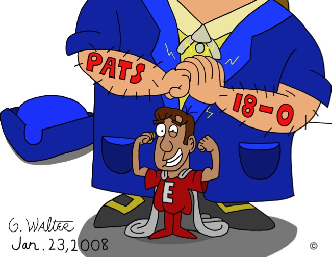 Another cartoon I watched growing up was “Underdog” which formed the basis for this cartoon. The SNY editors had named it “Super Eli,” so I’m guessing that they probably didn’t get the reference in my title. I decided that Eli and the Giants do make the perfect underdogs against Tom Brady and the Patriots. Once again it’s a battle between Boston and New York, and it’s just seems like destiny’s hand is again at work doesn’t it? A sad thing that the Giants will be remembered as the last team the Pats conquered on their way to perfection, and in truth I’m not much looking forward to it, but I’ll still watch the game - it is the Superbowl after all.