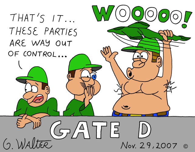 The indecent behavior at Gate D at the Meadowlands was ripe for a cartoon, but it had to be handled with great care. If women were being taunted to “go wild” then what would happen when a big fat guy does the same? I love the Jets fan who’s barely holding own his lunch.